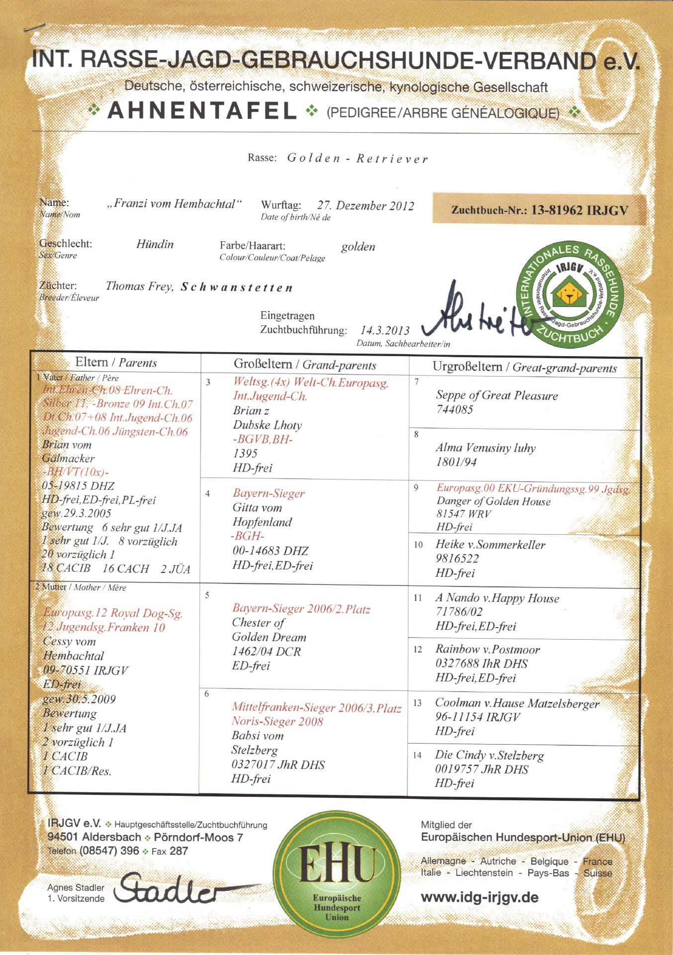 Der folgende Weblog soll der Familie ermöglichen über ihr Admin-Passwort Bilder und Kurztexte auf unserer Homepage einzustellen, um so die weitere Entwicklung unseres "Hembachtalers"zu dokumentieren.Wir die Züchter vom Hembachtal würden uns natürlich sehr freuen wenn wir ab und zu ein aktuelles Bildchen vorfinden würden, um weiterhin am Leben und der Entwicklung unserer Zöglinge teilhaben zu dürfen. (Achtung beim Passwort muß Groß- und Kleinschreibung berücksichtigt werden.)